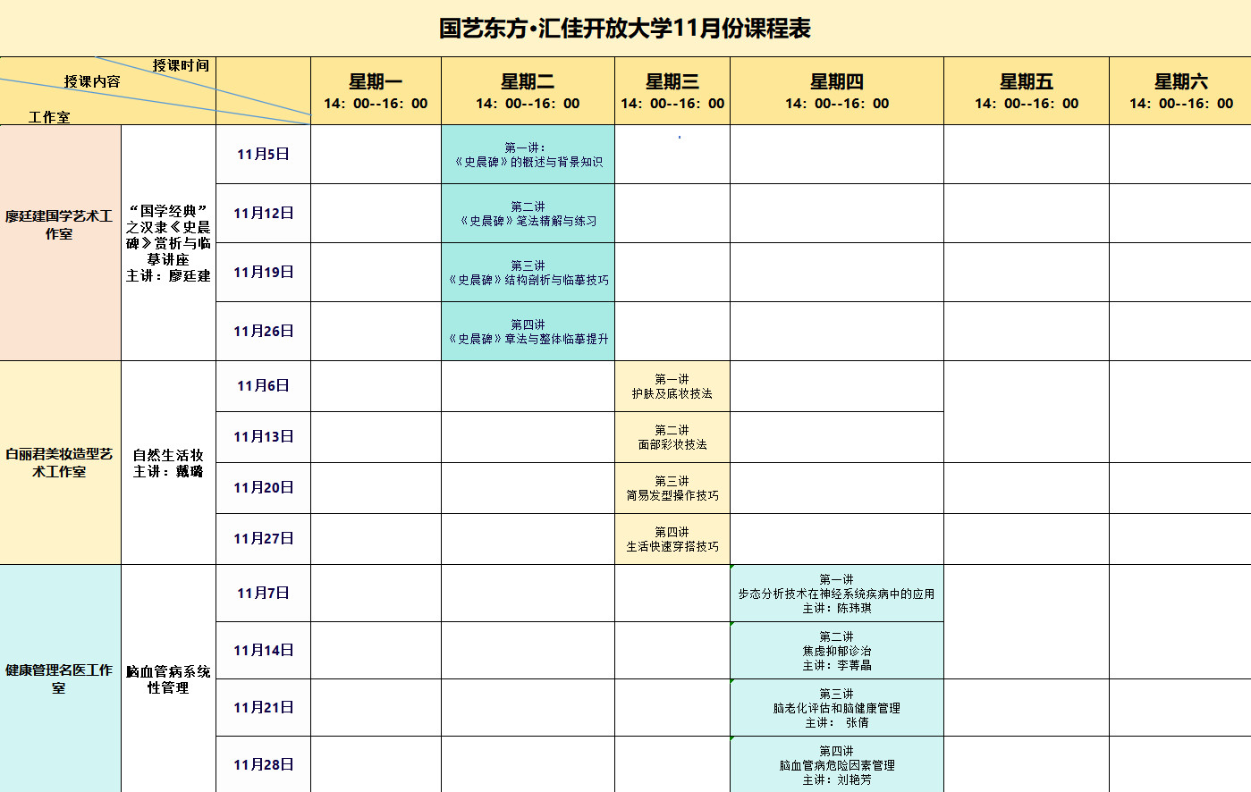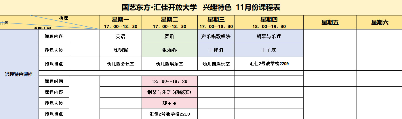 国艺东方·汇佳开放大学11月份课程表